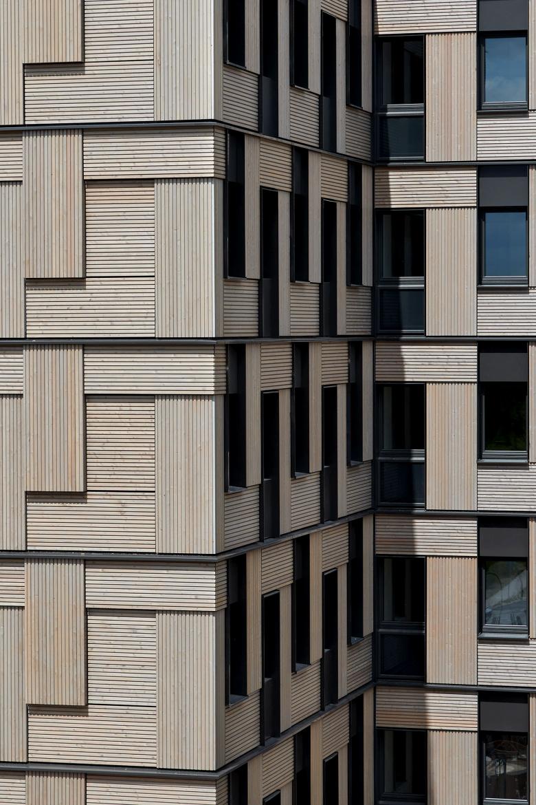 Die 20 m² großen Apartments wurden inklusive ihrer Einbauten komplett aus Vollholz vorgefertigt. Mit Ausnahme des Bodens aus Naturkautschuk sind alle Oberflächen holzsichtig belassen worden. Sie schaffen ein angenehmes und gesundes Raumklima für die Bewohner. Die hinterlüftete Vorhangfassade aus vorvergrauter Lärche und ist ebenfalls vorgefertigt.