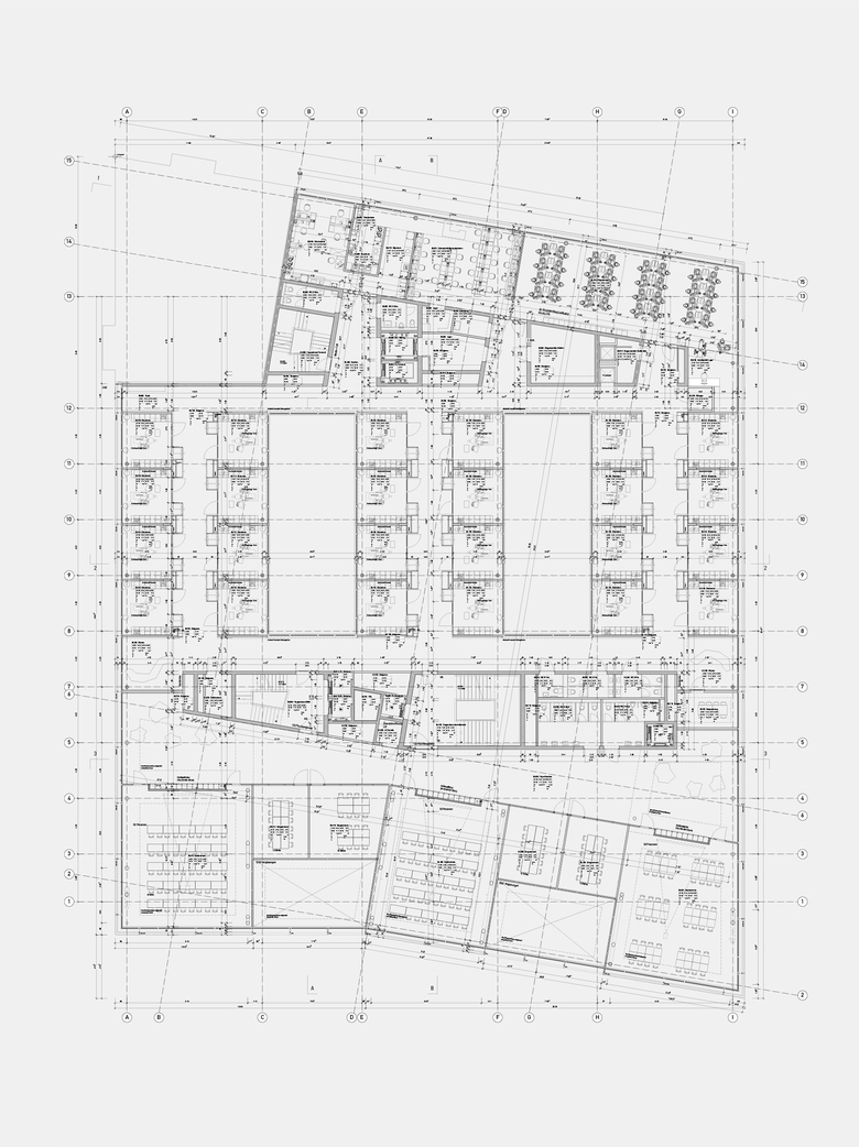 Das Areal befindet sich in einer Übergangszone zwischen Blockrandbebauung und Solitärbauten der chemischen Industrie. Ein flaches Volumen folgt den gegebenen Baulinien und Grenzabstände und besetzt einen grossen Teil des Perimeters. Der pragmatisch städtebaulichen Logik folgt eine räumliche Verschränkung der vorhandenen Strassengeometrie, die in einfacher Weise eine markante Volumetrie erzeugt und dem neuen Campus Rosental eine klare repräsentative Adresse verschafft.