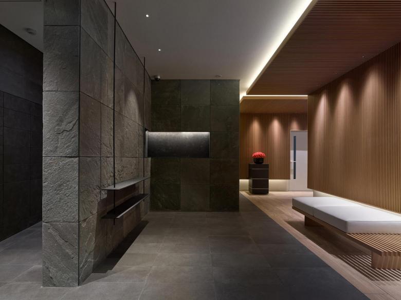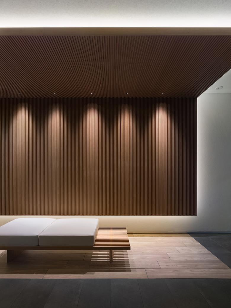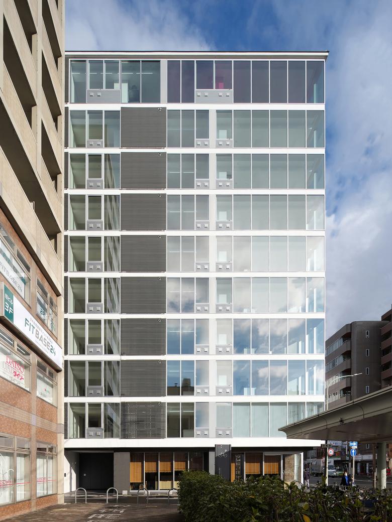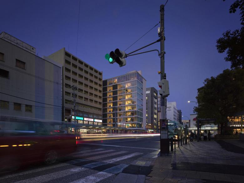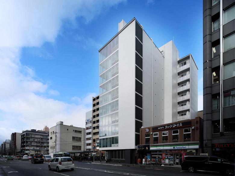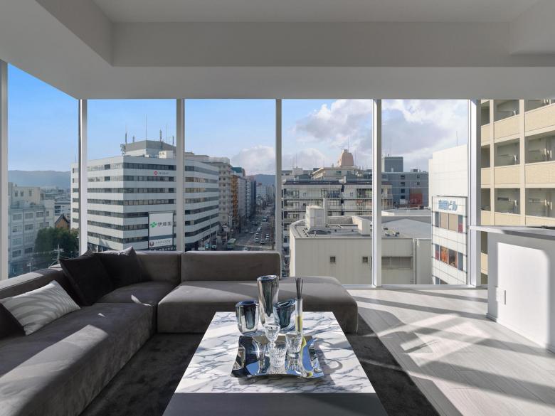 京都のダウンタウン、阪急電鉄四条大宮駅の駅前広場とメインストリートである四条通のコーナーに面して建つ集合住宅の計画である。24時間交通量の多い四条通に面するためその騒音に溢れた環境に建つ住宅に、通常のマンションのようなバルコニーが必要なのかと考えるところから設計は始まった。バルコニーは住戸の内部空間と外部の都市空間とのインターフェースの空間として、居住する人が外気と接するための重要な空間である。しかしこの四条大宮という騒然とした環境で本当にそれが必要なのか、むしろバルコニーをやめて床から天井までの大きな開口部を設けることで低いリビングの椅子に座ったままでもバルコニーの手摺に視線を邪魔されることなく、外部の風景を眺めることができるのではないか、換気や空調設備の導入については必要な設備を配備することで解決できる。この環境ではその方がバルコニーを設けることよりも快適な居住環境が実現できると考え、現在の開口部の形式を決定した。結果として騒然とした都市空間の中に声高に主張しない、しかし静謐で存在感のある集合住宅の形を提案できたと考えている。