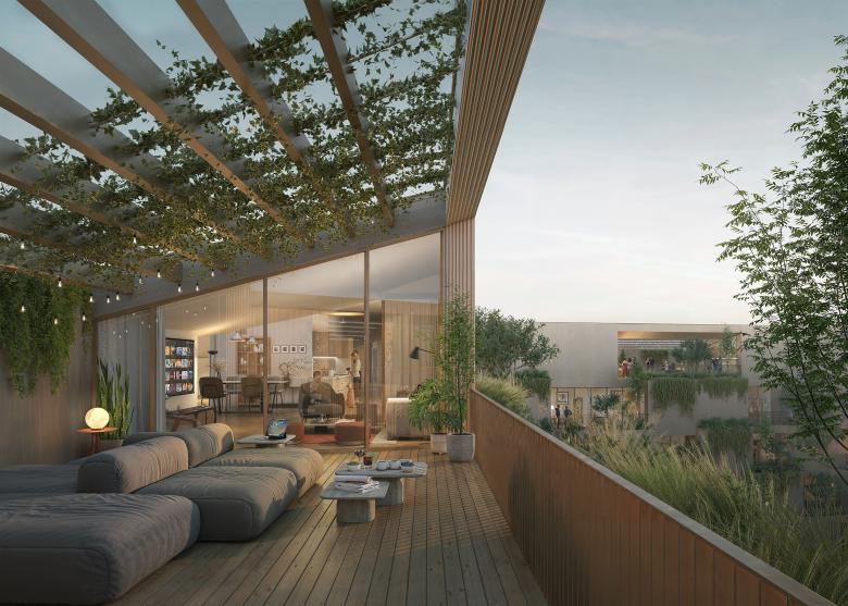 The masterplan introduces an open urban block with public arcades, green terraces, and a lush inner courtyard. Materials such as brick and recycled aluminum reinforce durability while anchoring the project to the local context. Florenc21 stands out for the quality of its shared spaces: a communal kitchen, co-library, relaxation areas, community hubs, digital connectivity, and smart services.