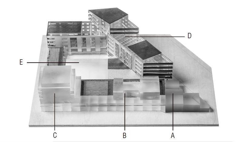 (D) A concrete-walled block that follows the limits of the plot and defines the urban from towards its sides.