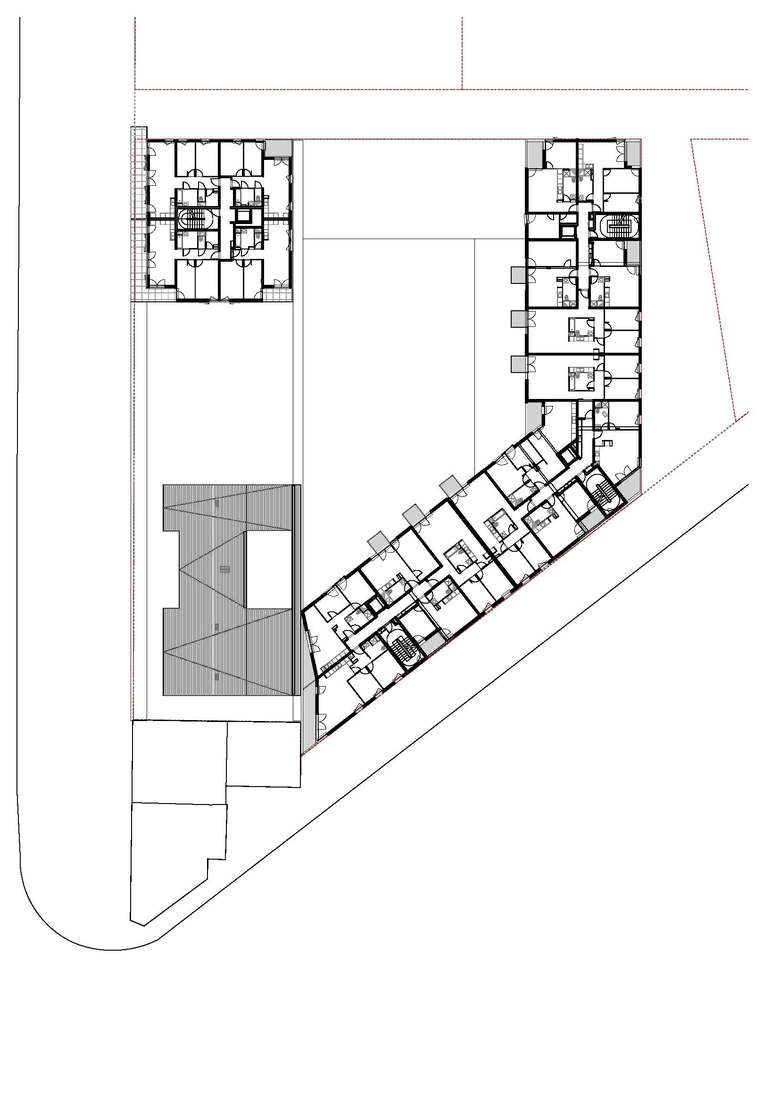 We build two storeys right across the plot, introducing the car parks at the centre and arranging dwellings around them, with services along the front.