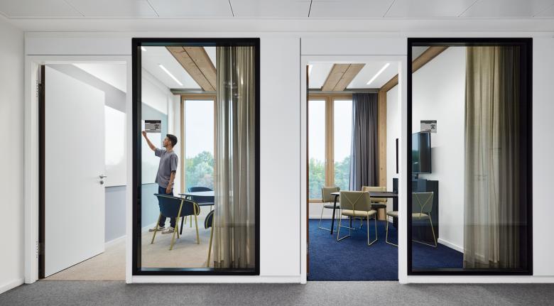 Vom halböffentlichen Raum des Atriums gehen im Erdgeschoss eine separate Konferenzzone mit Coffee Bar sowie eine angrenzende Kreativzone mit Projekträumen ab. Hier stehen vier kleinere Konferenzräume zur Verfügung sowie ein großer teilbarer Konferenzraum, der bei Bedarf zusammengeschaltet werden kann und Platz für bis zu 100 Personen bei Vortragsbestuhlung bietet. Die sechs Projekträume sind für besondere Kreativprozesse gedacht, in denen die Teams zusammenkommen können, um auch mehrtägig gezielt an Lösungen zu arbeiten.