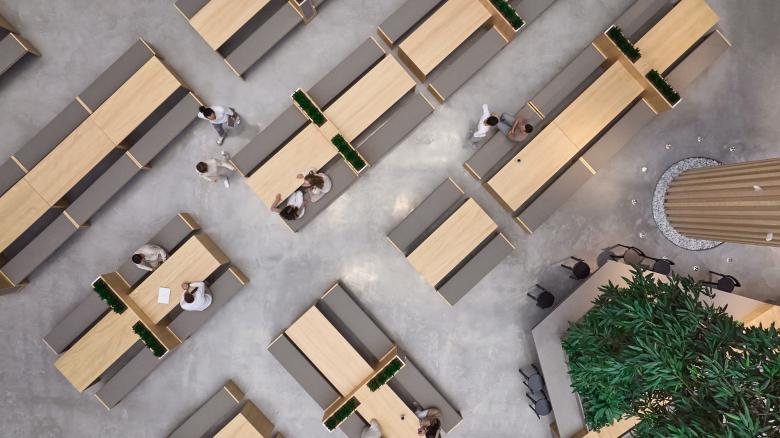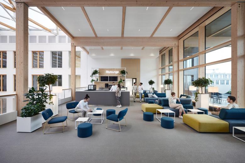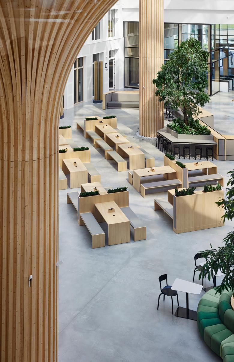 Die Gestaltung und Zonierung des Atriums mit seinen vier baumförmigen Stützen (Trees) war eine der größten Herausforderungen. Der Raum sollte als Restaurant und repräsentative Begegnungsstätte fungieren, zur Bewegung der Mitarbeitenden zwischen den Geschossen einladen, Sitzangebote für ungezwungene Meeting- und Co-Working-Situationen formulieren und zudem als Kommunikationszentrale dienen.