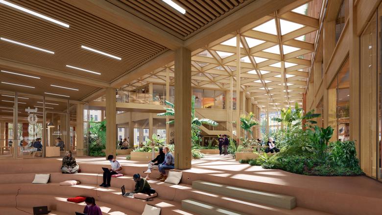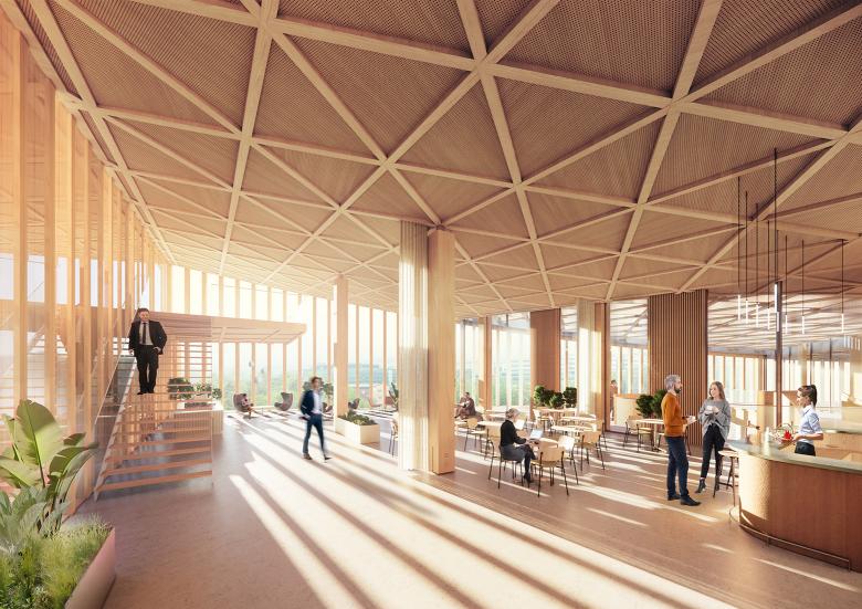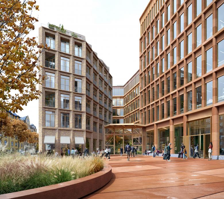 The corners of the building have been pulled back to make space for a new urban plaza. Here, people will have access to the roofed community room, the Orangery, which connects all the different functions in the building, offering a range of cafes, restaurants, and small boutiques. The transparency of the Orangery allows the public to follow what is going on in parts of the building reserved for scientists, students, and companies working within the life science sphere.