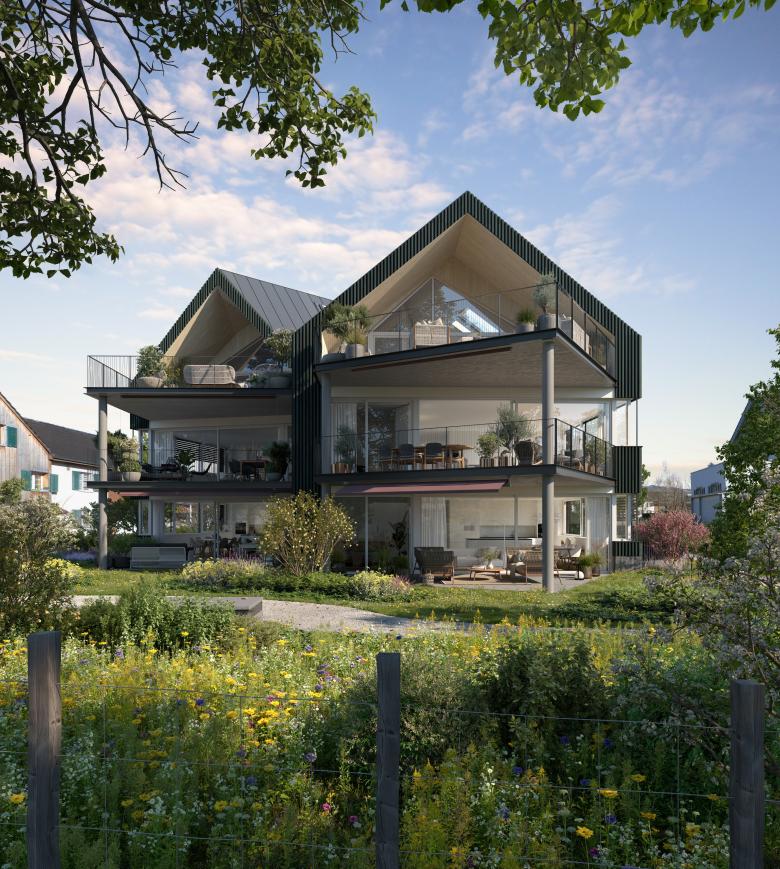 Unser vielfältiges Neubauvolumen nimmt den umliegenden Hofkontext auf und schafft eine durchdachte Aussenraumgestaltung mit klaren Zonen zum Verweilen, Spielen, Wohnen und Geniessen. Es verschmelzen Tradition und Nutzen in harmonischem Einklang.