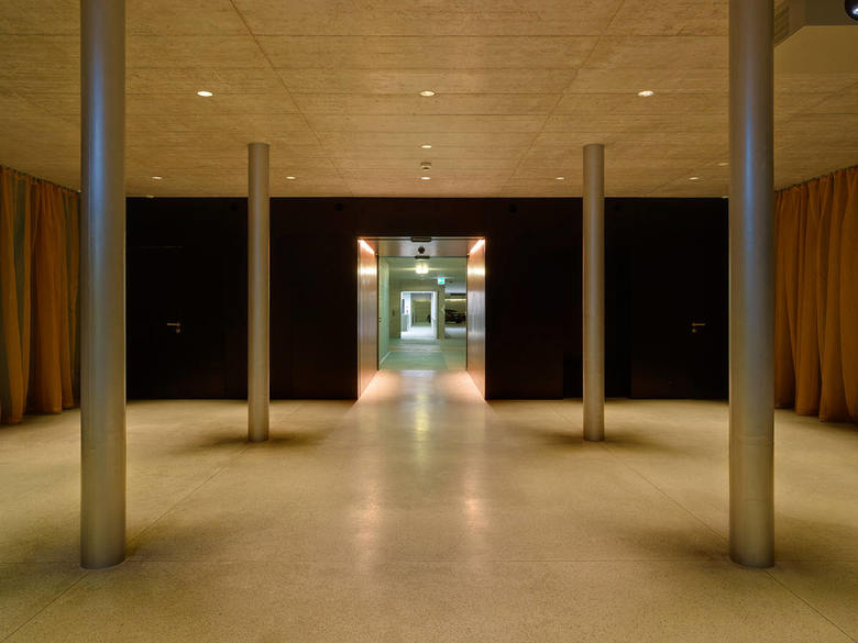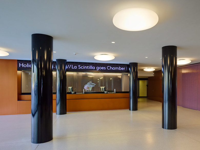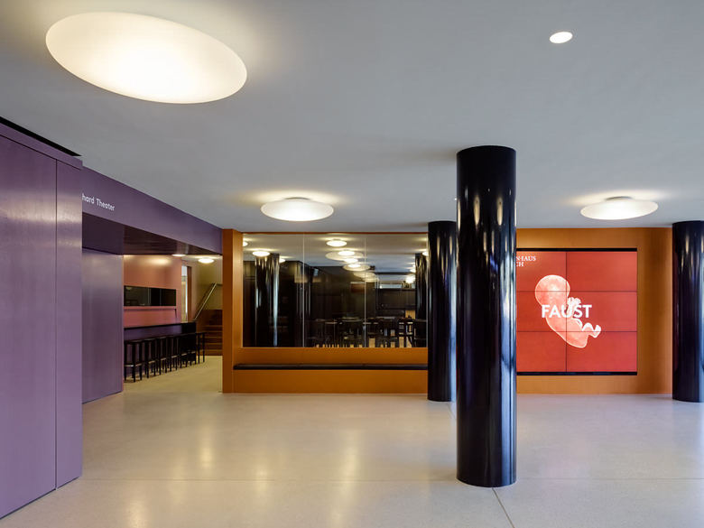 Der verglaste Lift führt hinauf in das neue Foyer, das zum Infozentrum mit Billettkasse und Garderobe Bernhardtheater umgebaut wurde. Ausserhalb der Vorstellungen des Bernhardtheaters schliessen die raumhohen Schiebetüren die Garderobe und werden zum diskret gefalteten Hintergrund des Foyer - raums. Bildschirme und ein LED – Laufband informieren über Vorstellungen und Angebote.