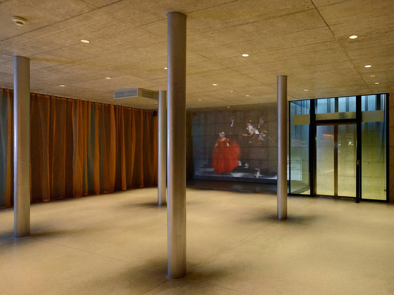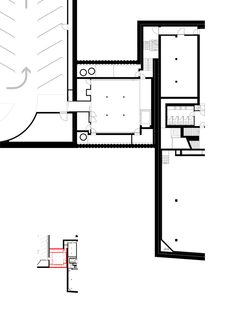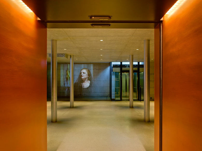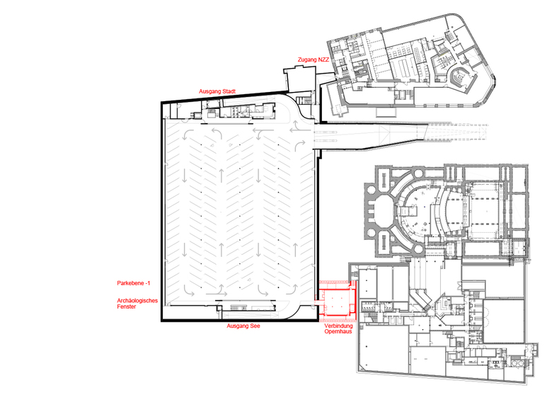 In Verlängerung des seeseitigen Aufganges des Parkhauses Opèra bietet sich heute auf der Ebene -1 der einladende Zugang zum Opernhaus. Schon von weiten leuchten die kupferfarbigen Wände der Schleuse in das Parkhaus. Der unterirdische Verbindungsraum vermittelt zwischen Parkhaus und Opernhauswelt: Er bildet mit der grossflächigen Projektion und den wandbegleitenden, farbig hinterlegten Kupfervorhängen den festlichen Auftakt zur Oper. In Bild und Originalton zeigen sich hier grossformatig die aktuellen Opern- und Ballettproduktionen.