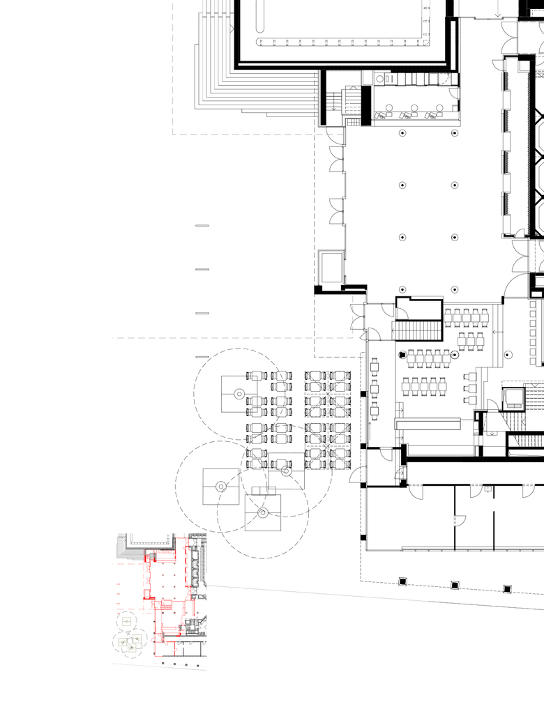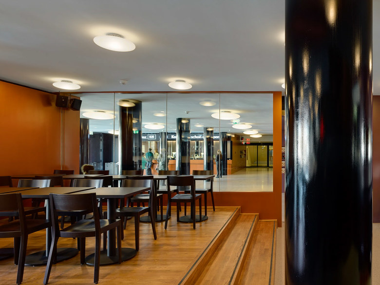 Durch das neue angrenzende Bistro mit Aussenbestuhlung erhält das Restaurant Belcanto den gross-zügigen Anschluss an den Sechseläutenplatz. Die um drei Stufen angehobene Hauptebene des Bistros verweist auf die komplexe Umbausituation: unter dem scheinbaren Podest befindet sich direkt die bestehende Lüftung des Ballettsaals.