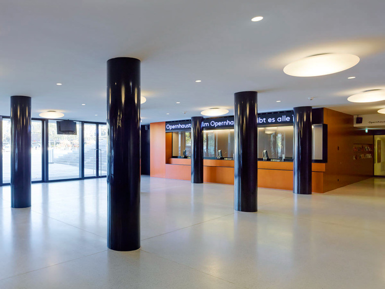 Die helle Farbe des gestrahlten Kalkbetons lässt das neue Foyer zum Teil des Opernhaussockels werden. Der lachsfarbene Verwaltungsbau tritt dabei optisch subtil in den Hintergrund.