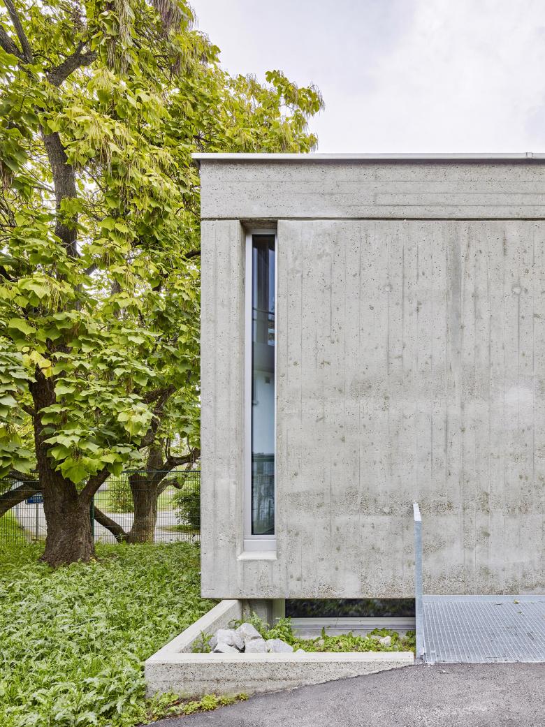Die Materialisierung ist auf wenige Grundelemente reduziert und orientiert sich am Charakter des Ursprungsbaus. Die repräsentativen Räume sind mit einer durchlaufenden Holzakustikdecke aus Eiche ausgestaltet, die mit Kugel-Pendelleuchten einen geeinten Horizont erhalten. Die Böden sind als Pendant zur mineralischen Strassenwelt mit einem robusten, geschliffenen Zementunterlagsboden gestaltet. Die raumhohen Türen, die Holz-Metall-Fenster und die Nassbereiche bringen Farbe ins Gebäude. Die Betonfassade erscheint nach einer umfangreichen Sanierung wieder in ihrem ursprünglichen, rohen Sicht-Charakter und bildet zusammen mit den Holz-Metall-Fenstern in Aluminium das robuste Kleid des Hauses.