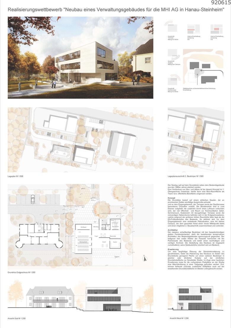 Der in einem nicht offenen Realisierungswettberb 2015 mit dem 2. Preis ausgezeichnete Entwurf liegt neben dem Bestandsgebäude der MHI AG aus den 1990er Jahren in Hanau Steinheim. Die Grundidee basiert auf einem einfachen subtraktiv bearbeiteten Quader. Der massive, scharfkantige Baukörper mit den fassadenbündigen glatten Fensterelementen, steht der bestehenden konservativen Architektur des Bestandsgebäudes spannungsvoll gegenüber. So definiert sich vor dem Eingangsbereich eine einladende Platzsituation, eine Art kleiner Campus, der dem gesamten Areal einen neuen Mittelpunkt bietet und einen möglichen 2. Bauabschnitt zusammenfasst und verbindet. Die Bürobereiche sind in zwei Ebenen aufgeteilt, die zusätzlich durch einen Luftraum verbunden sind, der viel Offenheit und Raum zur Kommunikation bietet. Seminarraum, ein Casino mit dazugehöriger Terrasse sowie die notwendigen Nebenräume befinden sich im Erdgeschoss Der hellgraue fast weiße Klinker der Fassade harmoniert mit der Putzfassade des Bestands und bietet einen nachhaltigen und wertigen Kontrast. Die Gestaltung des Neubaus ist insgesamt zurückhaltend, seine Gebäudehöhe orientiert sich am Bestand.