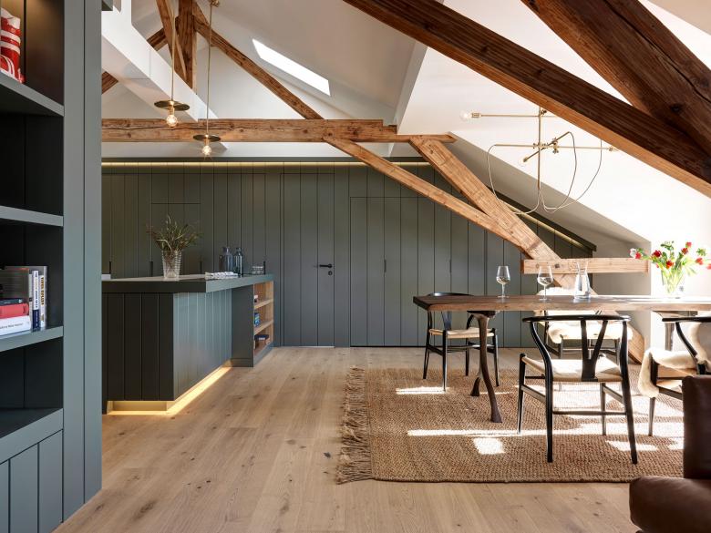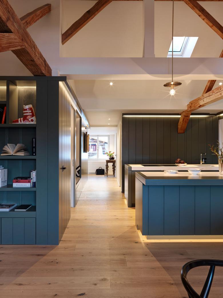 This historical building from 1882 marks the entrance to the village of Flims in the Swiss alps. The client wanted a holiday home with character in the mountains and found a property with a lot spatial potential to realize this dream. Locked away in the attic, this space on first sight was very small and claustrophobic. To bring out its full size and body, it was clear that we had to be unfold it in three dimensions and reveal as much as possible. Besides opening up the hidden roof, the main concept of Vianova was to find a mix between traditional and contemporary styles and make them blend in together as one. By revealing the pitched roof, the ancient wooden structure was also brought into the light and all spaces gained a new, larger scale.