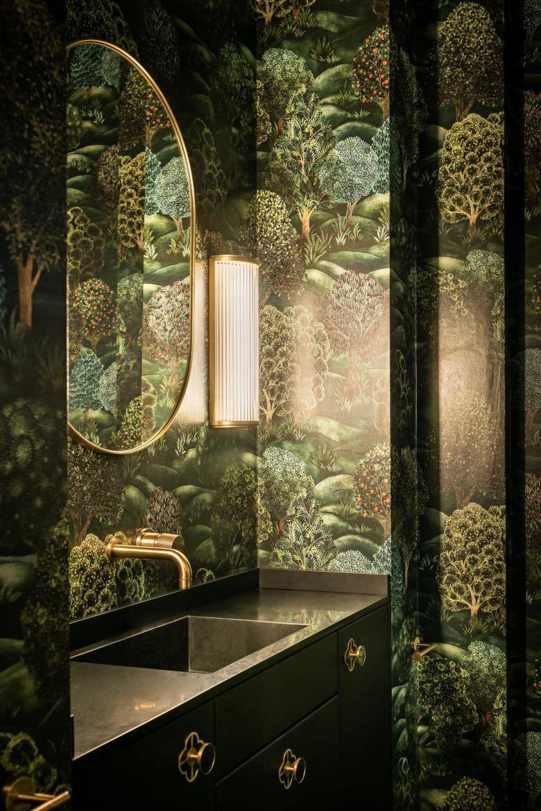 The guest bathroom is completely covered with fine English wallpaper with a lush floral pattern. The ambience is made elegant by matt black sanitary ware and steel fittings with a special brushed bronze finish.