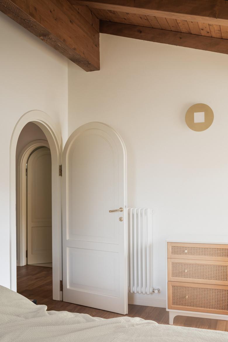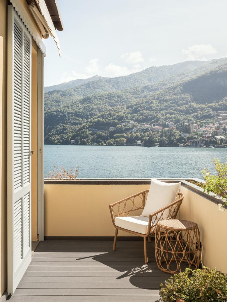 The architectural intervention involved the complete renovation of the building, in particular of the entire plant engineering, kitchen, bathrooms and surfaces. The roof was also reclaimed, replacing the old roof tiles. The original pantographed wooden frames, doors and skirting boards, were moderately recovered thanks to the professionalism and specific know-how of local Como craftsmen. All the original teak and panga-panga floors, laid in the Italian herringbone pattern, are also part of the recovery of materials that are now almost off the market.