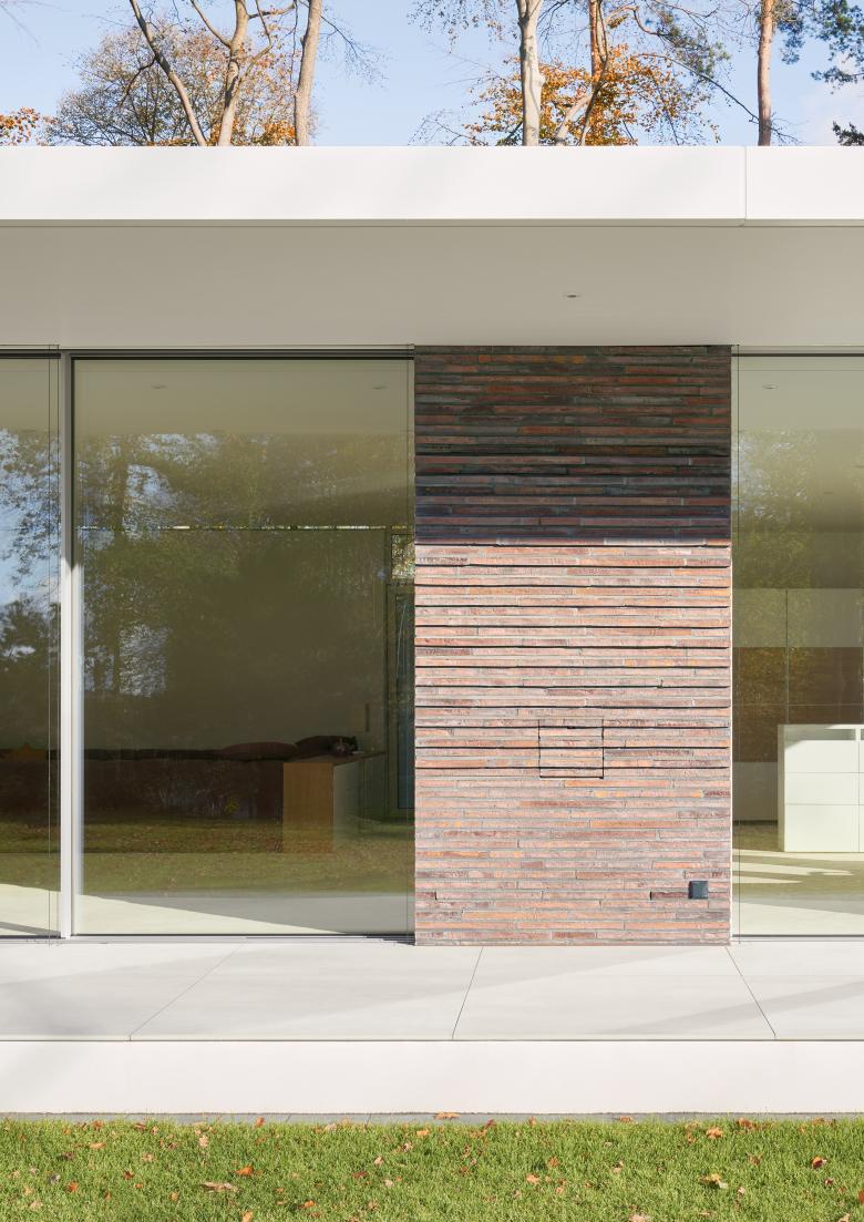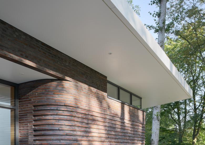 Der langgestreckte, eingeschossige Baukörper besticht durch seine schlichte Fassadengestaltung. Ein dunkler Klinker im Dünnformat verläuft reliefartig entlang der Straßenfassade und betont die horizontale Ausrichtung des Gebäudes. Diese zeitlose Gestaltung fügt sich mühelos in die umliegende, gewachsene Wohngegend ein.