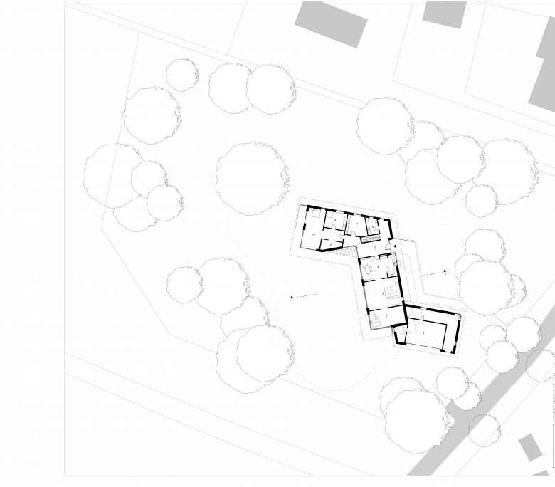 Die Gestalt des Wohnhauses, dessen Grundriss an ein `Z` erinnert, nimmt die vorgegebene Topographie des Grundstücks auf. So gelingt eine durchdachte räumliche Abfolge, die private Rückzugsorte mit zentralen Wohnbereichen und einer großzügigen Garage für bis zu drei Fahrzeuge verbindet.