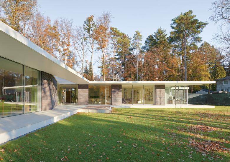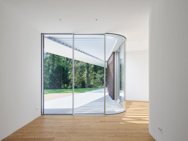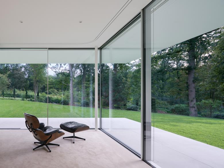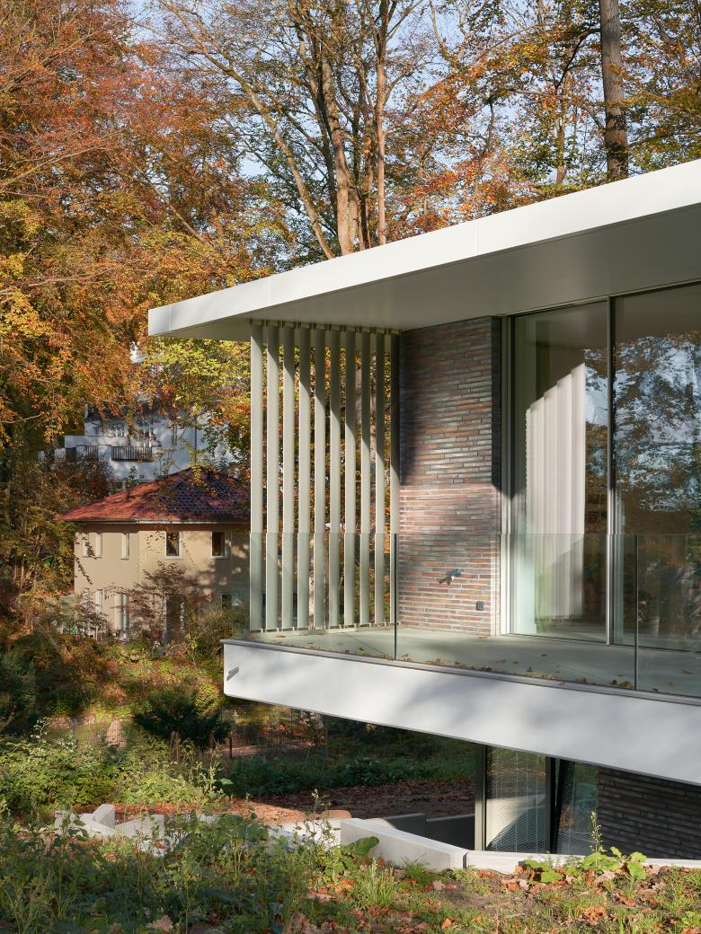 Auf der Gartenseite schaffen raumhohe, rahmenlose Fenster eine nahtlose Verbindung zwischen Innenraum und Außenwelt und fluten das Haus mit Tageslicht. Alle Räume sind auf das grüne Panorama ausgerichtet, das das besondere Wohnambiente des Hauses ausmacht. Der weit auskragende Dachüberstand – eine Stahlkonstruktion auf dem Betondach – ist in diesem Bereich mit Lamellen versehen, die ein reizvolles Spiel von Licht und Schatten erzeugen.