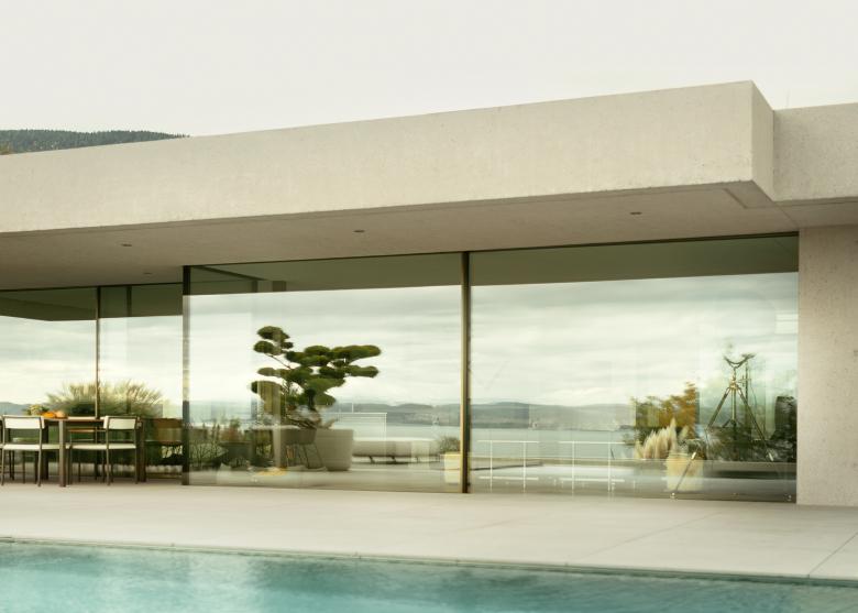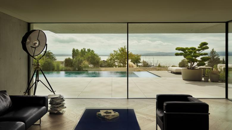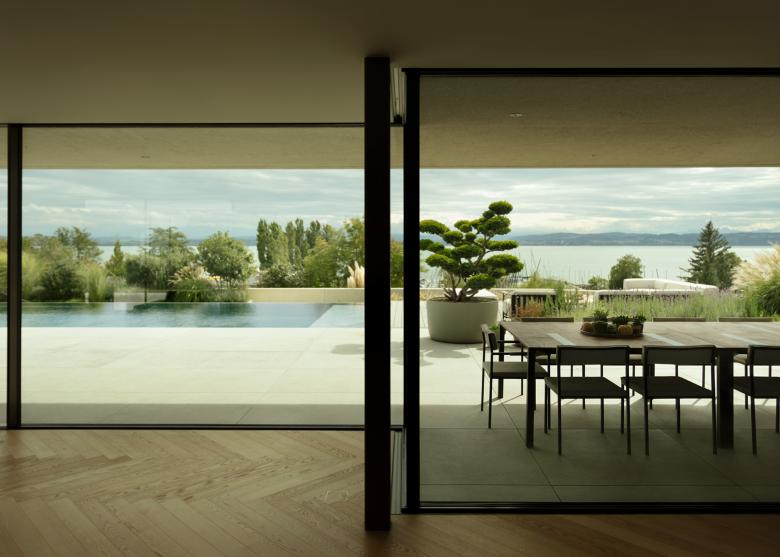 Le jardin a été aménagé pour assurer la privacité tout en conservant la vue sur le lac de Neuchâtel et les Alpes. Il devient ainsi naturel de vivre autant à l’intérieur qu’à l’extérieur en toute quiétude.