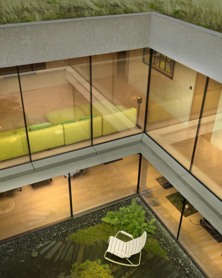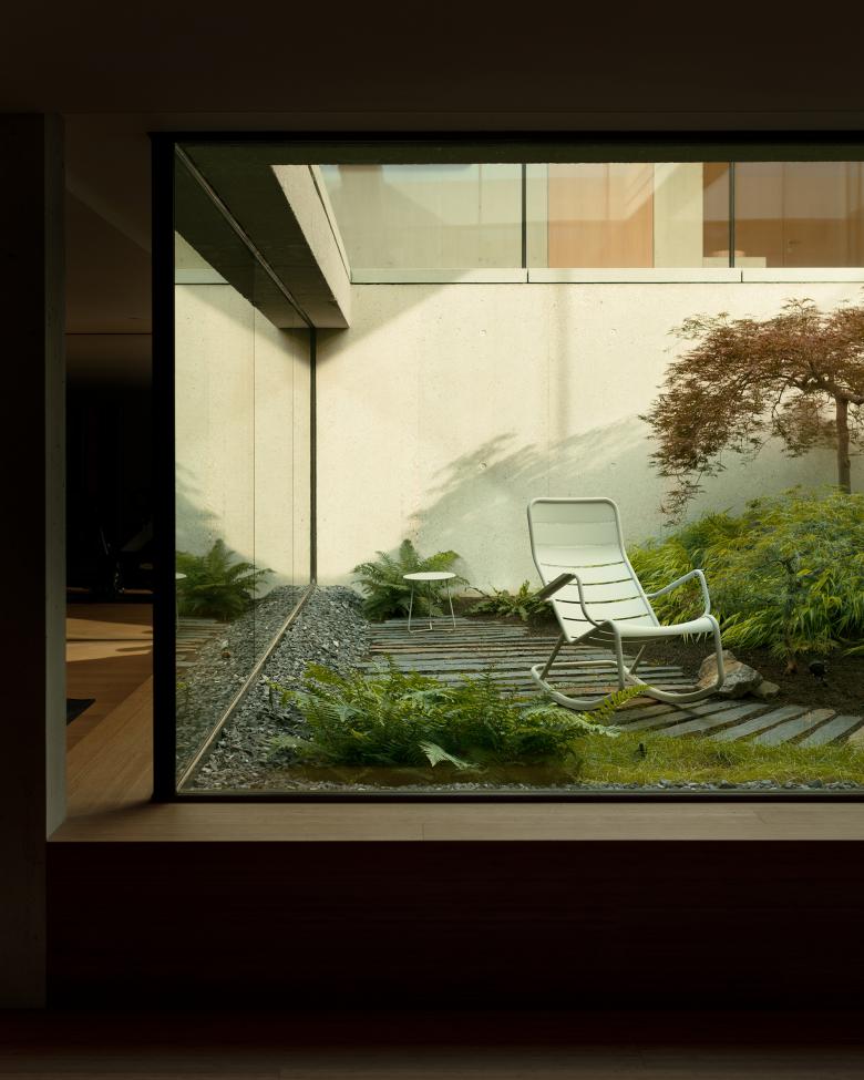 Le jeu de transparence se poursuit jusqu’au cœur du projet ou l’on découvre un patio en double hauteur. Il offre des perspectives et des liaisons visuelles entre différents espace de l’habitation. Préservé des regards extérieurs, le patio dévoile en contrebas un jardin invitant à la relaxation. Autour de cet élément central baigné de lumière se développent, le bureau, les espaces de détente et les espaces de nuit.