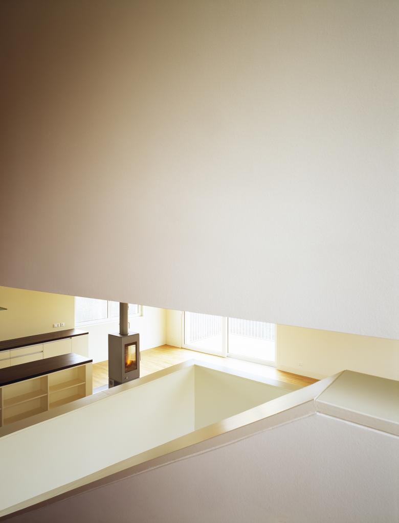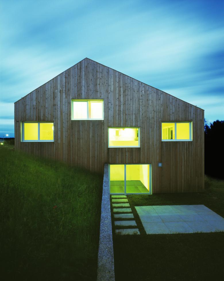 En fin de zone constructible, la villa n’a pas bouleversé leur quiétude. Elle dialogue paisiblement avec ces éléments, comme si elle avait toujours été là. Seul le mur qui la relie au terrain provoque une légère dépression de celui-ci, au pied du chêne, ménageant ainsi un patio extérieur au sein de la prairie. La terrasse vient s’y lover et, avec le mur pour messager, dialogue avec la percée verticale intérieure qui accompagne l’escalier et relie les espaces. Les vaches et les chevaux de la ferme familiale n’ont jamais quitté ces lieux et continuent de paître tranquillement alentour.