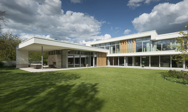 The limitation of using just a few materials such as oak and walnut, Bauhaus travertine and white plaster, which both can be used outside and inside and with the exception of plaster, for walls and floors, accomplish the villa and garden to be unified into a harmonious ensemble.