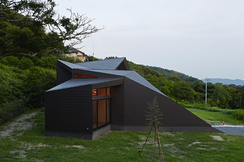 After entering the entrance along a triangular side wall, the outdoor view is temporarily shut off and people find themselves in a gradation of light. There is a folded-plate space that rises towards the second floor, and a semicircular bathroom is placed in the space. By going towards the light while feeling a contrastive structure, a wide-open ocean view enfolds. When entering the living room, the view widens even more in a longitudinal direction to the sky. After the place with a tall framed scenic view, the view become rapidly narrower and then lands beyond the bathroom area once again. The interior sequences are handled as if they are melodies, and the spaces are connected as if accumulating harmonies.