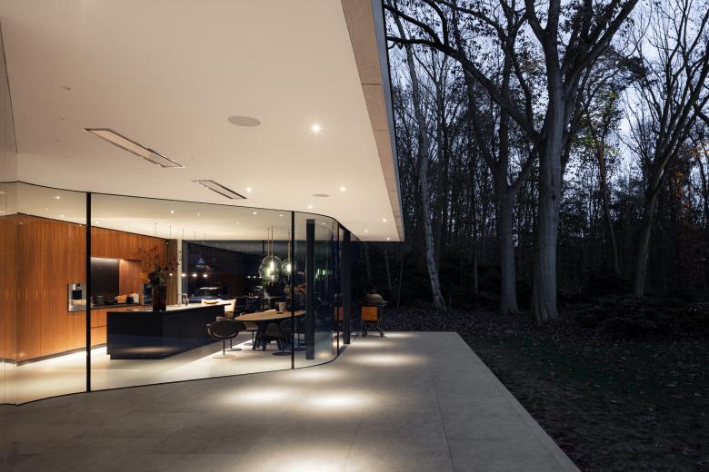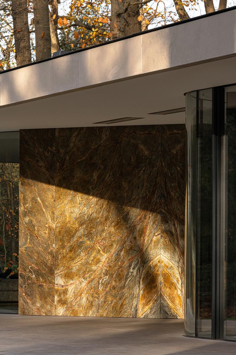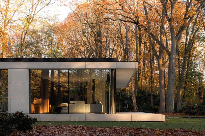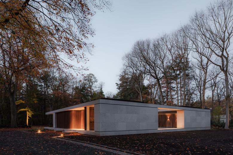 Based on an elongated U-shaped floorplan, our Villa JM presents a secretive stone face to the world, revealing only a tantalizing glimpse of its inner world in the shape of its central courtyard. Inspired by the location, an extensive wooded site in the south of the Netherlands, we discreetly positioned expanses of glass to offer our clients the best of the natural views, while closed volumes safeguard their privacy. Natural stone and wood add depth to our elementary one-story design, which pairs sober straight lines and monumental volumes with seductive curves and sinuous glass walls.