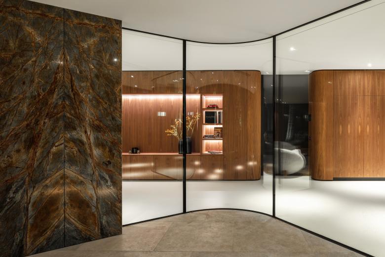 While the heavy stone volumes and austere straight lines recall a serene retreat, the curved lines and glass walls evoke the lightness of being. The latter emerges especially in the living room, which is bounded entirely by glass. Only one small section, detailed in the facade in richly veined marble, is closed. Simple white plaster surfaces and carefully crafted built-in furniture elements enhance the uncluttered esthetic.