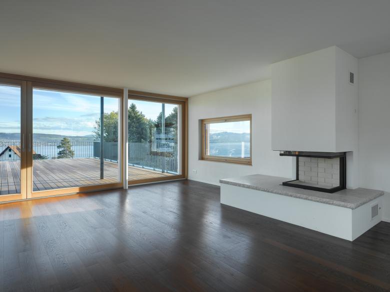 The VILLA L is situated in the vicinity of Lake Zurich and has a unique terrace, which promises an enchanting panoramic view of the Alps. The villa offers three bedrooms, three bathrooms, one indoor and one outdoor wellness area as well as two indoor and two outdoor parking spaces on three floors. The wide bay windows, which convey a certain airiness, evoke a sovereign level of relaxation. The master suite has a modern walk-in wardrobe and a Mediterranean-style private bathroom.