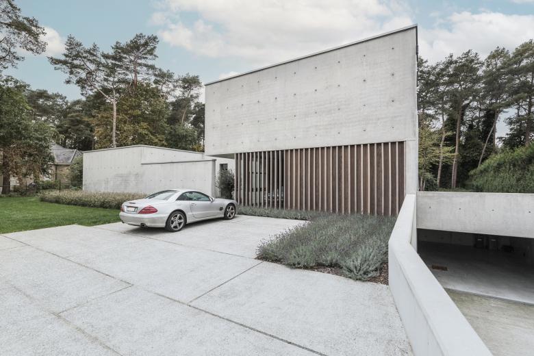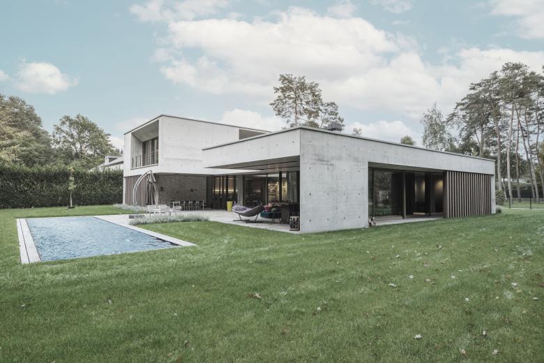 Inmitten einer grünen Einfamilienhaussiedlung im belgischen Maasmechelen haben PCp Architects ein freistehendes Wohnhaus entworfen, das sich mit einer nüchternen, zeitgemäßen Architektur vollständig in seine Umgebung einfügt. Auf der Straßenseite präsentiert sich die Villa als geschlossener Betonmonolith, während die großen Fenster in der Rückfassade die grüne Umgebung einbeziehen.