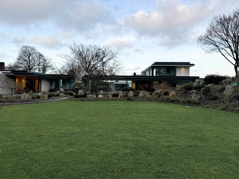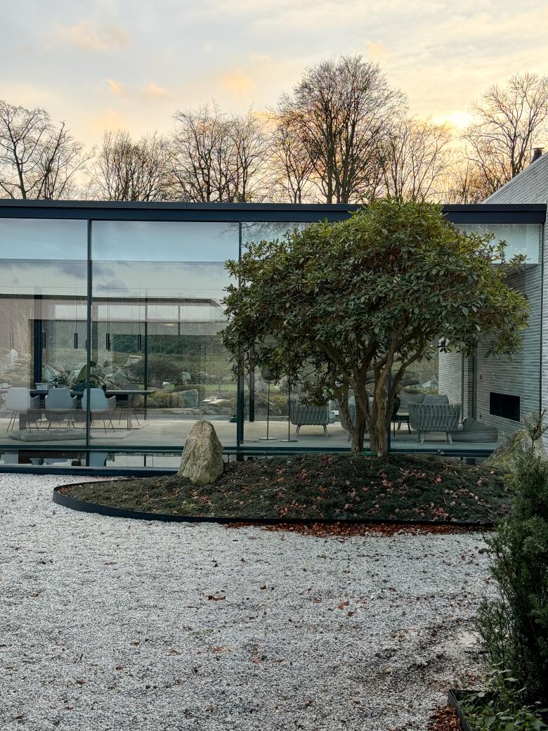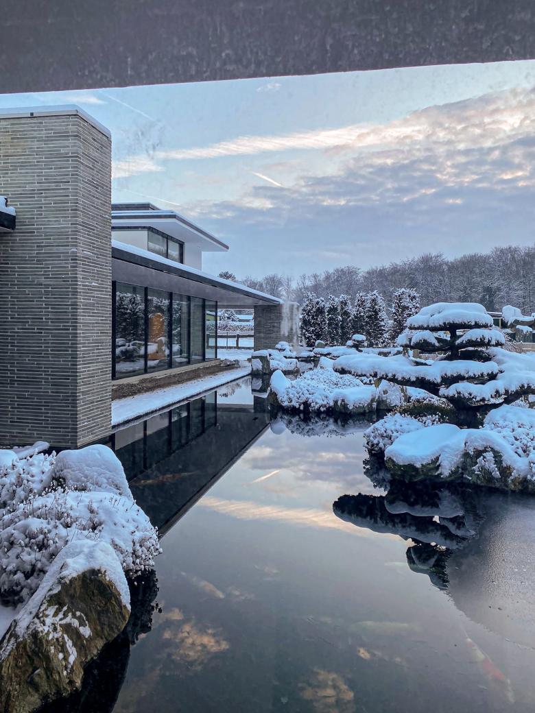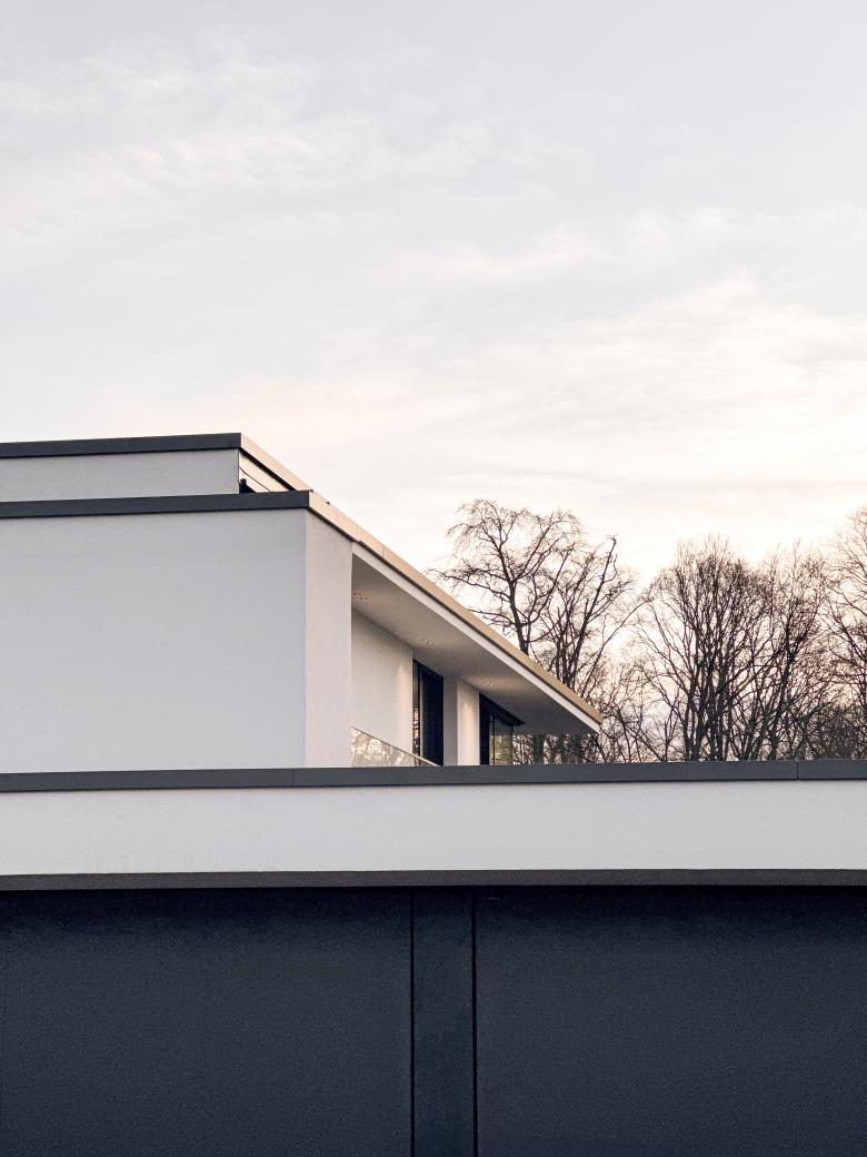 Das Einfamilienhaus entsteht auf einem 5000qm großen Grundstück mit Waldrandlage. Es entsteht ein Ensemble aus Architektur und Aussenraumgestaltung. Der Baukörper breitet sich pavillonähnlich auf dem Grundstück aus und schafft Innen und Aussenräume die fließend ineinander übergehen. Der repräsentative Bereich des Hauses bettet sich wie ein Steg zwischen die großzügig angelegten Teichflächen. Von diesen Räumen aus eröffnet sich der Blick in Richtung des Waldes und dem Patio der von einer Showgarage gefasst wird.