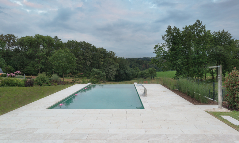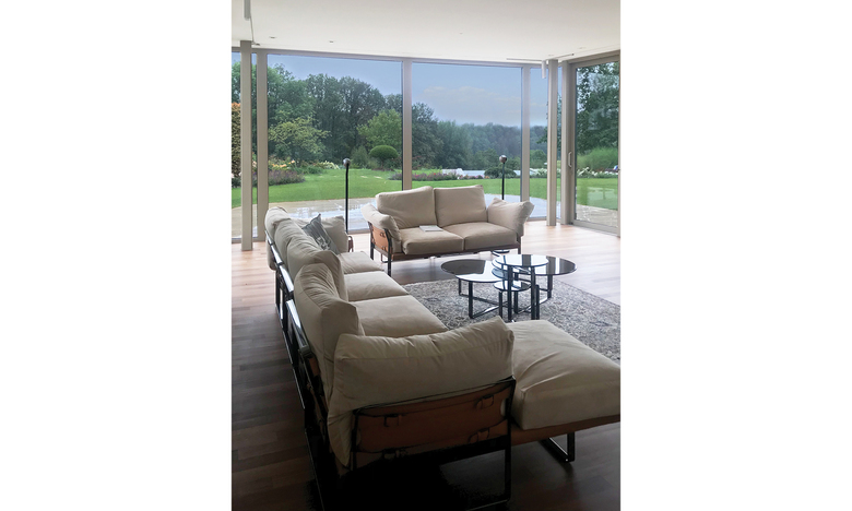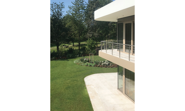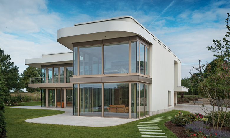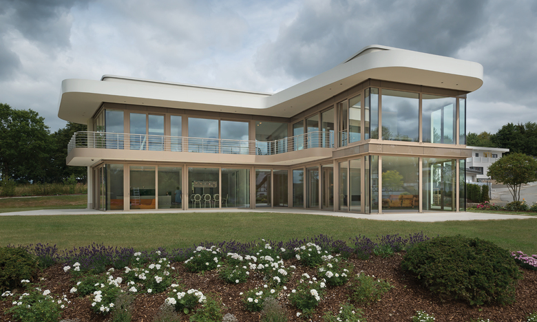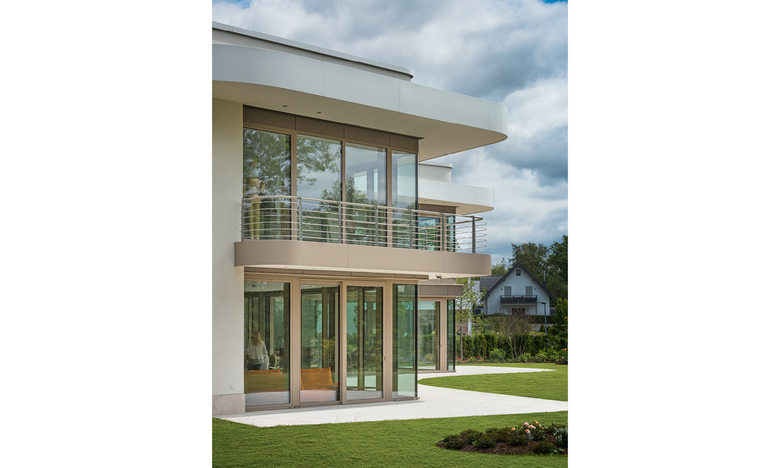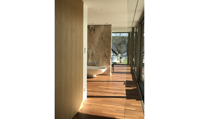 An elegant, restrained color palette and materials such as Bauhaus Travertine, Afromosia wood and champagne colored metallic powder coated aluminum profiles give the house its unique character.