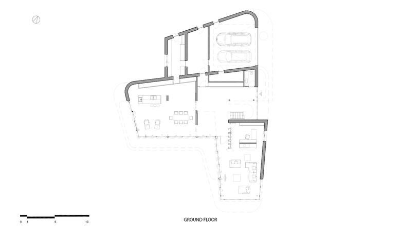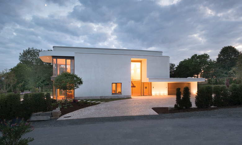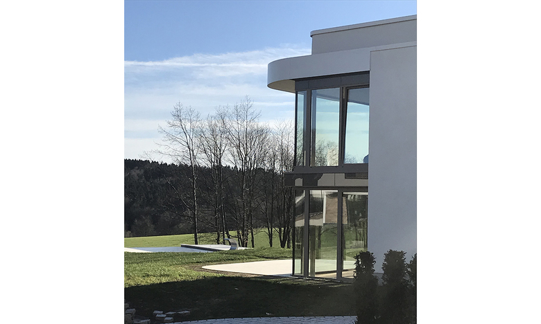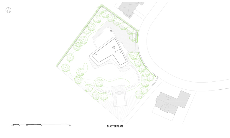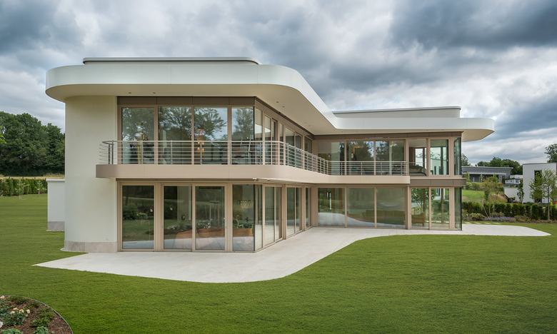 Villa N, a house for a young family is realized on a plot on the hillside with views of the meadows, pastures and forests of the landscape Bergische Land. The L-shaped building volume shows itsself extrovert to the south, the garden and the views and at the same time shields itself off with a soft elegant movement of white plastered walls to the buildings in the neighborhood. A deep, two storey high cut in the facade marks in a subtle way the entrance and provides in the closed facade the visual relation between interior and exterior. The building lives of the harmonious interaction of open glass-aluminum facades, white plastered, rounded wall surfaces and far cantilevered roofs. This makes the appearance of the building volume dynamic and fits the house in the hilly landscape.