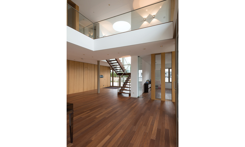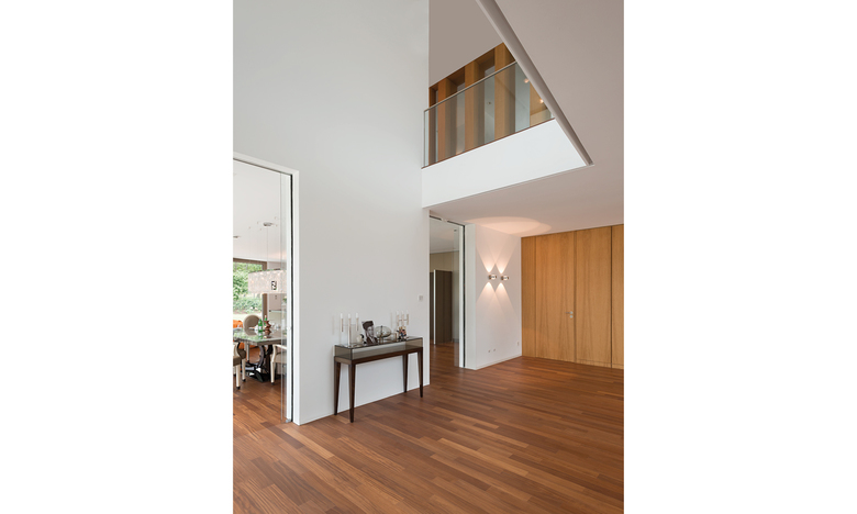 A spacious entrance hall in the heart of the L-shaped floor plan connects via a central void, the open living areas downstairs with the bedrooms upstairs. The spacious living kitchen with large dining area as a central place of daily life, can be opened with sliding doors to the hall and also be connected with the generous living room, which is open to the landscape too.