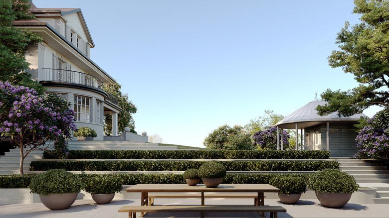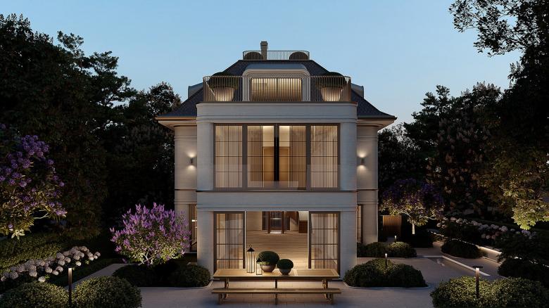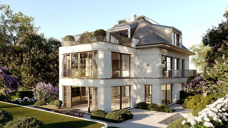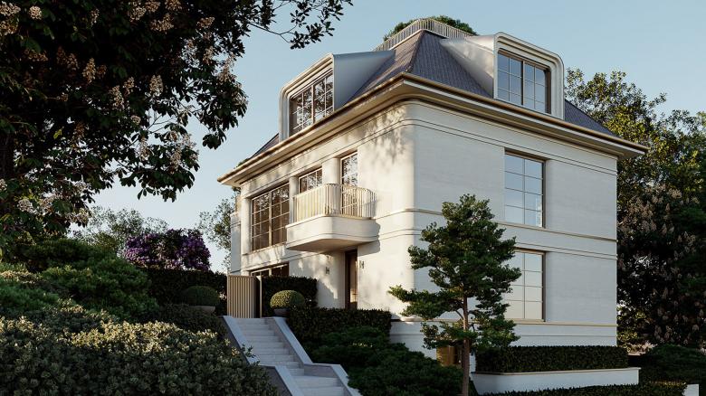This villa plays with the architectural language of classicism while subtly revealing that it has been constructed using the latest technologies in building design. A solid stone facade made of limestone, paired with a discreet allusion to its contemporaneity through softly rounded corners, which elegantly hint at its character.