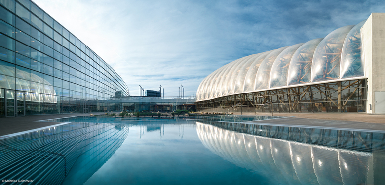 The complex, conceived as a fully environmentally-responsible project is labelled HQE (“Haute Qualité Environmentale”) and can be considered an emblematic reference of this architectural philosophy. This was the main question L35 had to consider in the design: the complex had to respect the surroundings and minimise the impact on the environment and landscape. The firm proposed a series of integrated volumes which would hide under ondulating green roofs harmonising with the surrounding fields.