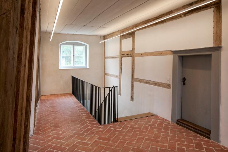 Das Sanierungskonzept setzte auf größtmögliche Substanzerhaltung, traditionelle Handwerkstechniken und den konsequenten Einsatz natürlicher, regionaler Materialien: Der Sand stammt aus Frickenhausen, der Kalk aus Altmannstein, das Fichtenholz aus dem Sachsenrieder Forst und die handgeschlagenen Ziegel aus Oberbayern. Neben der denkmalgerechten Instandsetzung war auch die behutsame Ergänzung zeitgemäßer Elemente entscheidend. Notwendige Ergänzungen wurden so ausgeführt, dass historische Spuren erlebbar bleiben und neue Eingriffe klar ablesbar sind. Diese entwickeln den Bestand weiter und überführen ihn in die heutige Zeit. So entstand ein Wohngebäude, das die Anforderungen der neuen Nutzung erfüllt, ohne seinen historischen Charakter zu verlieren. Im Erdgeschoss wurde zudem eine halböffentliche Zone geschaffen, die als kultureller Begegnungsraum im ländlichen Raum dient.