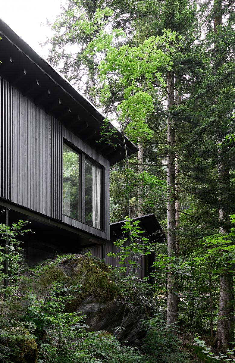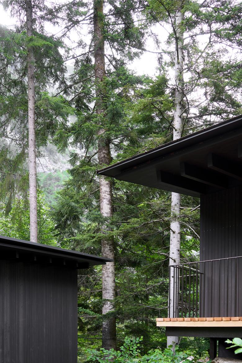 Im naturgeschützten Wald des Berner Oberlandes, erweitert das Hotel Blausee sein Angebot um drei externe Hotelzimmer. Jedes der drei Baumhäuser trägt einen eigenen Namen und spezifischen Charakter. Das Mooshaus sitzt zwischen zwei mit Moos überwachsenen Felsen mit grossen Öffnungen in beide Richtungen. Das Steinhaus sitzt auf einem Felsen über einem steilen Abhang oberhalb der Wanderwege, von welchem man einen Blick über die Baumkronen hat. Das Waldhaus ist von Bäumen eingebettet. Jedes der Baumhäuser besitzt einen Schlaf- sowie einen Aufenthaltsbereich, ein Bad und eine kleine Aussenterrasse. Die Konstruktion besteht aus zwölf filigranen Stahlstützen, welche die Baumhäuser schwebend erscheinen lassen.