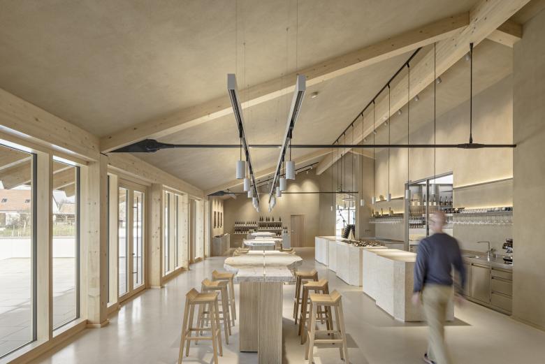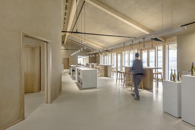 Von der Presse über die Fahrwanne, zur Traubenannahme bis zum Rotweintank und weiter bis zum Dach liegen rund 15 Meter Höhenunterschied. Damit öffnet sich ein Raum mit freier Sicht auf die innovative High-End-Produktionskette ¬– und das Herzstück der Weinproduktion höchster Güte. Das Licht fällt ausschließlich von oben durch insgesamt acht Flächenfenster in den Bauch der Weinkellerei. Die Halle nützt durch ihre Lage im Hang das Erdklima und ist nach dem Low-Tech-Prinzip ressourcenschonend und wartungsarm gestaltet. Der Einsatz von Lehmputz an der Wand und insbesondere in Verbindung mit der Kühldecke fördert auf natürliche Weise das Raumklima in den Büro-, Shop- und Verkostungsräumen. Die Verwendung von angeworfenem Kalkputz aus der Hand eines Meisters des Fachs würdigt traditionelle Kalkfassaden regionaler Presshäuser. Der Neubau am Bio-Weingut Gruber Röschitz ist ein Projekt höchsten Innovationsgrades und ökologischer Verantwortung.