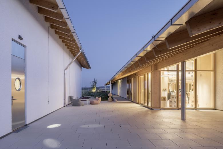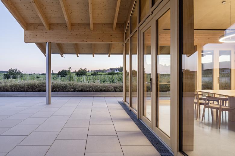 Das mit Vorreitercharakter modernisierte Weingut zeigt sich in einem zweigeschoßigen neuen Gebäude mit Herstellung, Lagerung, Shop, Küche, Verkostung und Büro an einer Adresse. Die Produktion im Untergeschoß ist in die Tiefe des Hanges gegraben und nach Produktionsphasen geteilt. Präsentationshaus und Rotweinhaus liegen darüber und sind jeweils mit markanten Satteldächern gedeckt – sie verneigen sich vor dem Weinviertel. Der schwellenlose Haupteingang im Norden führt zu Büro-, Shop- und Verkostungsräumen, im Süden und Westen schließt ein großzügiger überdachter Außenbereich an. Die Umrundung des Weinguts für das Erlebnis der Weingärten steht auch Besucher:innen offen. Mehrere Terrassierungen mit Frei- und Gründachflächen schaffen überdies großzügige Aussichten in angrenzende Weingärten und die Region, am Gründach ist die Halle begehbar. Eine Panoramastiege verbindet den Shop- und Verkostungsbereich mit der Produktion.