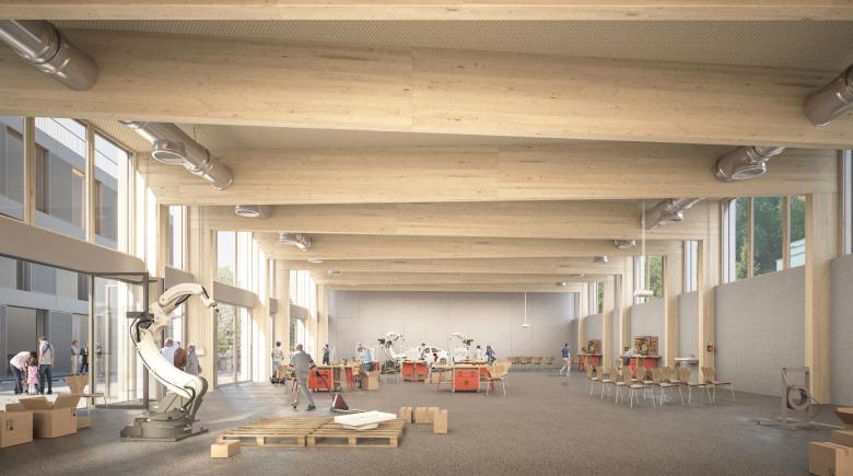 Durch die Aufteilung in zwei Volumen fügt sich das Gebäude massstabsgerecht und selbstverständlich in das bestehende Gefüge ein. Das neue Kompetenzzentrum gliedert sich in zwei Bereiche. Der überhohe eingeschossige Multifunktionsraum öffnet sich mit einer grossen verglasten Fläche zum Campusgelände und präsentiert trans- parent und selbstbewusst sein wechselndes Innenleben. Der viergeschossige Gebäudeteil lehnt sich in seinem architektonischen Ausdruck an die bestehenden Bauten auf dem Gelände an und präsentiert sich gleichzeitig als zukunftsweisend in seiner Bauweise, Kompaktheit und Effizienz. Das Gebäude ist mit seinem aussteifenden Betonkern (Treppenhaus, Lift, Infrastruktur), dem Holzskelettbau und den Holz-Beton-Verbunddecken als Hybridbau konzipiert. Die räumliche Gliederung des Gebäudes folgt der Struktur des Holzbaus, welche innen und aussen ablesbar ist. Der kompakte und klar strukturierte Baukörper, die hoch wärmegedämmten Holzelemente der Gebäudehülle, die gewählten Materialien sowie die optimale Tageslichtnutzung stellen eine nachhaltige und ökonomische Bauweise sicher.