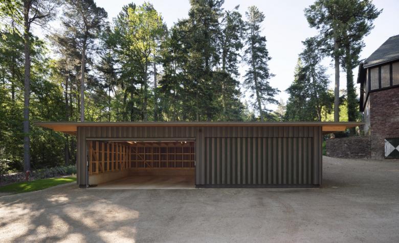 Ein ergänzenden Schuppen in einfacher Holzbauweise beherbergt die PKW Stellplätze, so daß der Hof zukünftig (wieder) als Treffpunkt für alle Generationen fungieren kann. Ein Wasserreservoir für die Feuerwehr wurde unterhalb des neuen Garagengebäudes geschaffen.