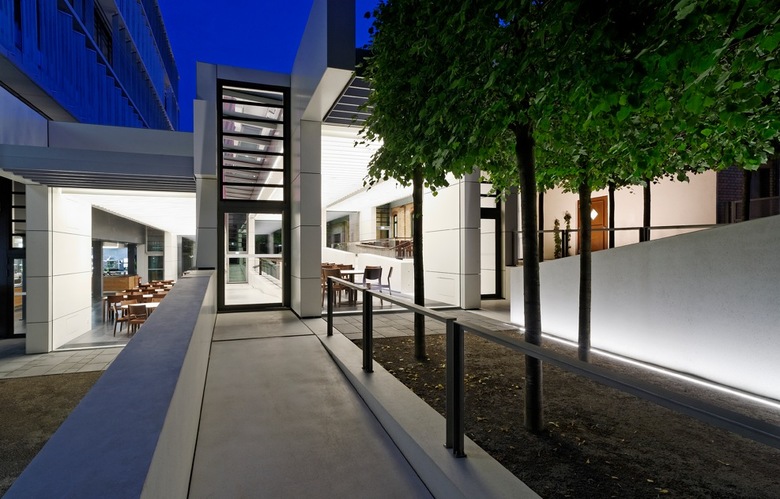 Die Aussenanlagen sind in drei Ebenen strukturiert und führen als visuelle Verlängerung den Innenraum nach Aussen fort. Die architektonische Komposition wird dabei durch lineare LED-Uplights im Bereich der trennenden Betonscheiben und der Vegetation sowie durch eine weiche Fassadenflutung der „Alten Wache“ verstärkt. Fein abgestimmte Beleuchtungsniveaus, sowohl auf den horizontalen wie den vertikalen Flächen, unterstützen die Architektur und schaffen eine angenehme Atmosphäre.