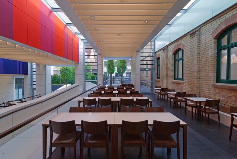 Auf einer Seite der Oberlichter verstärkt ein farbenreiches Kunstwerk das architektonische Konzept. Ein lineares LED-Profil auf der gegenüberliegenden Seite beleuchtet diese Farbfläche, um dessen Wirkung zu steigern, zur Blauen Stunde und während der Abendstunden. Abgesehen von der unmittelbaren Wirkung erzeugt die Reflexion des beleuchteten Kunstwerkes einen dezenten angenehmen Farbverlauf auf den hellen Architekturflächen, der, abhängig vom eigenen Blickwinkel, variiert.