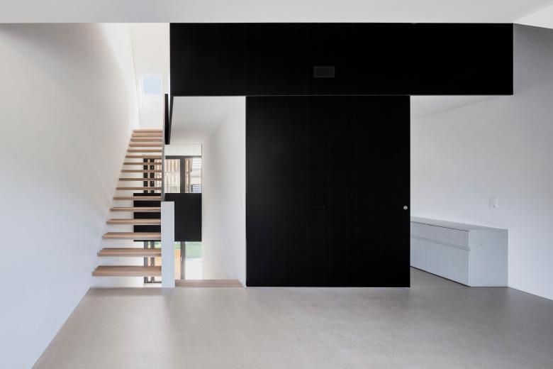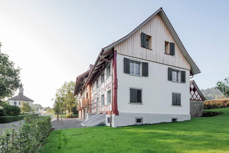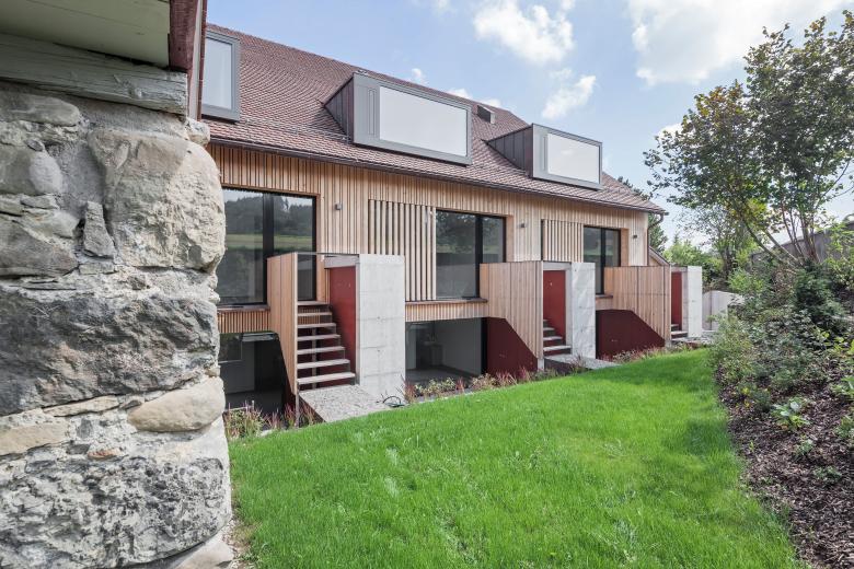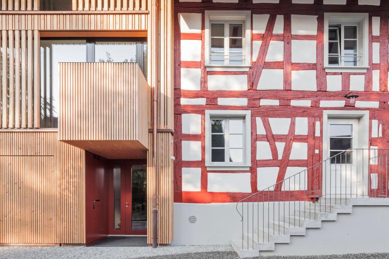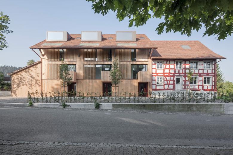 Im ausgebrannten Riegelhaus mit angrenzender Scheune konnten vier zeitgemässe Wohneinheiten realisiert werden. Die bestehende Tragstruktur des Riegelhauses konnte erhalten werden, und an der Stelle der Scheune wurde ein Ersatzbau errichtet. Eine Treppe mit angrenzendem Kern für Nassräume und Küchen erschliesst alle vier Geschosse innerhalb jeder Wohnung. Die vertikale Holzschalung mit halboffenen Schiebeläden nimmt Bezug auf die ehemalige Scheune. Grosse Gauben erlauben grosszügige Ausblicke und bringen viel Licht ins Dachgeschoss.