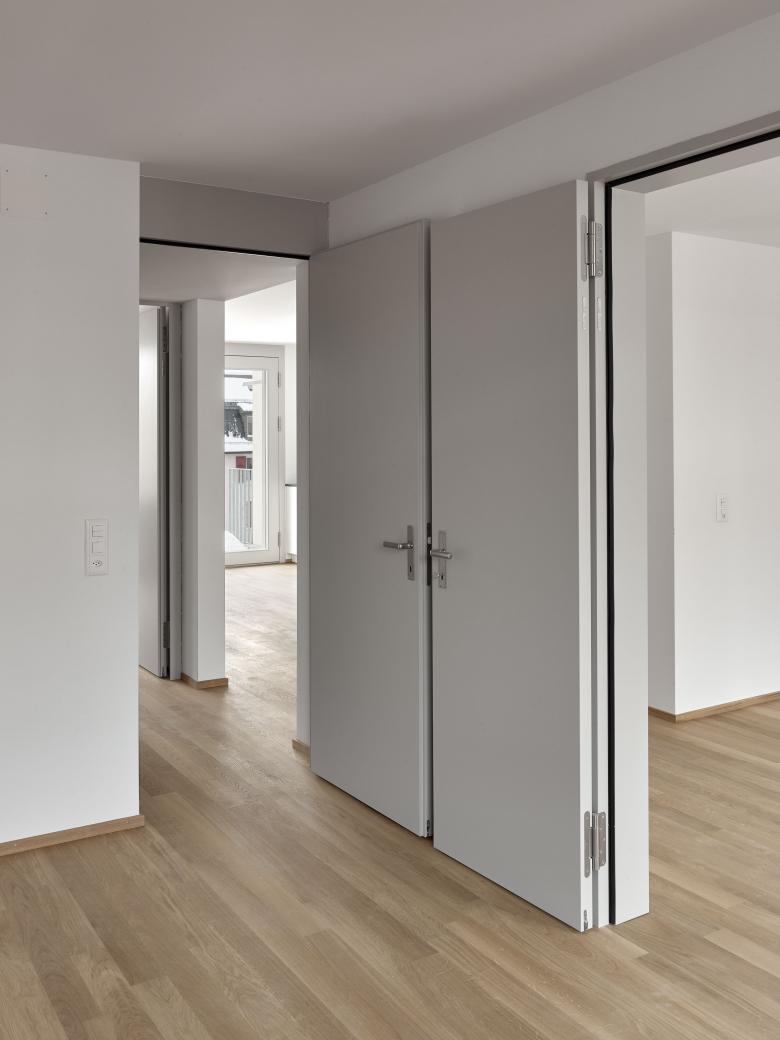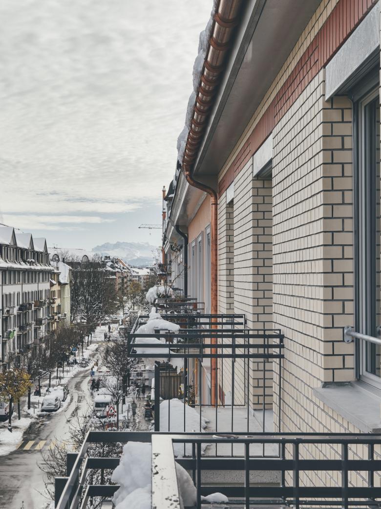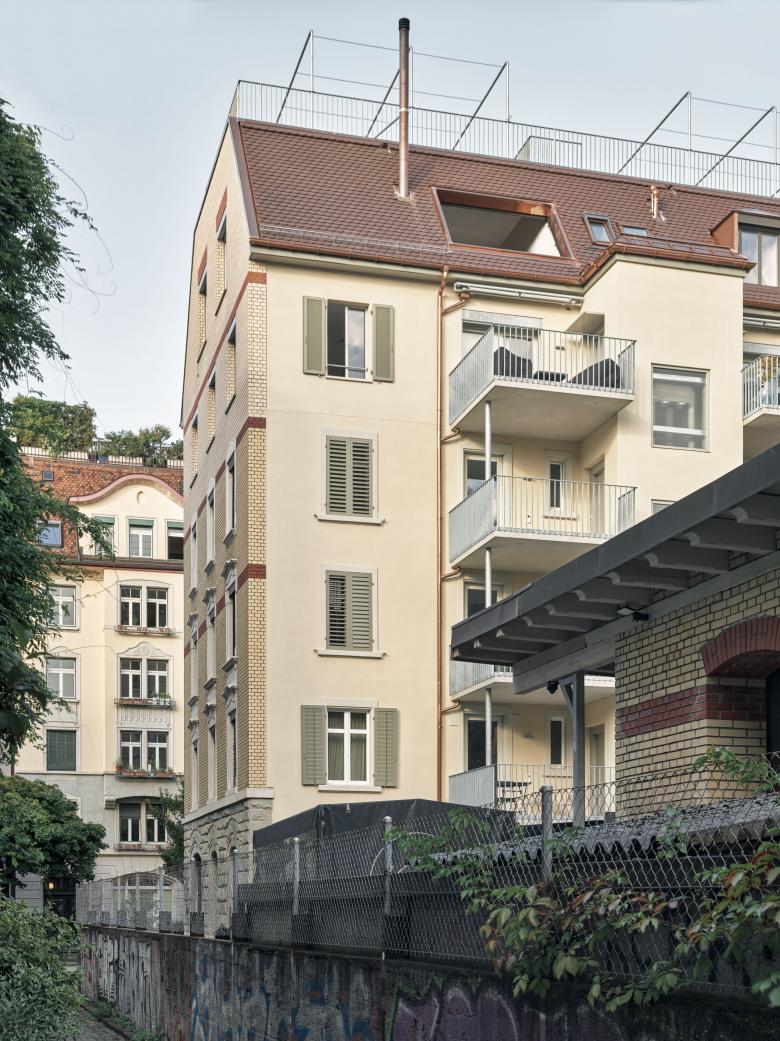 Der Aufbau des obersten Geschosses wurde als Holzbau ausgeführt und nur mit einer hinterlüfteten Klinkerschale verblendet, wodurch die neue Aufstockung nur auf den zweiten Blick als solche erkennbar wird. Hofseitig wurde ein Lift an die vergrösserten Balkone der bestehenden Wohnungen angebaut. Dadurch sind diese rollstuhlgängig.