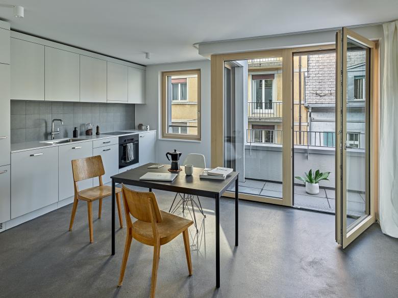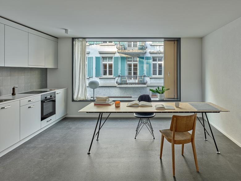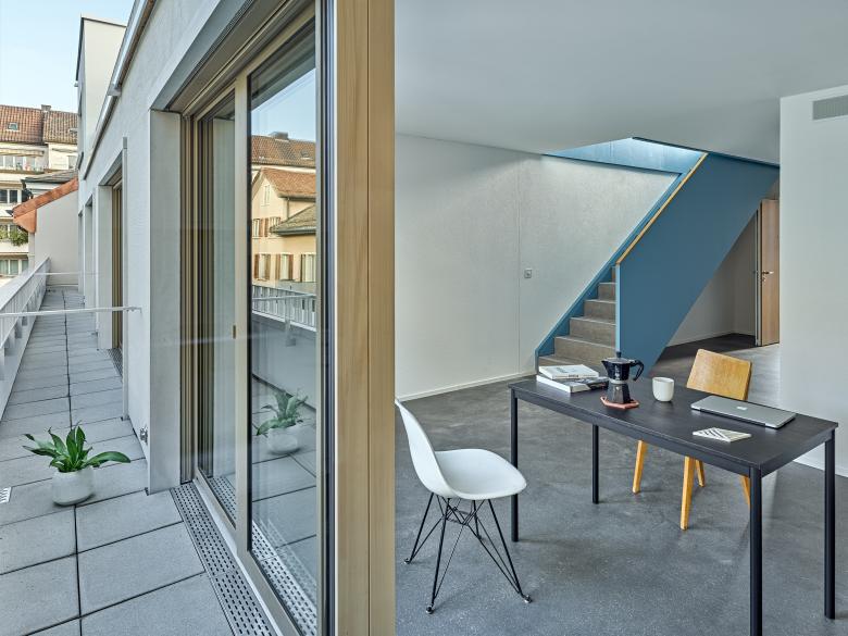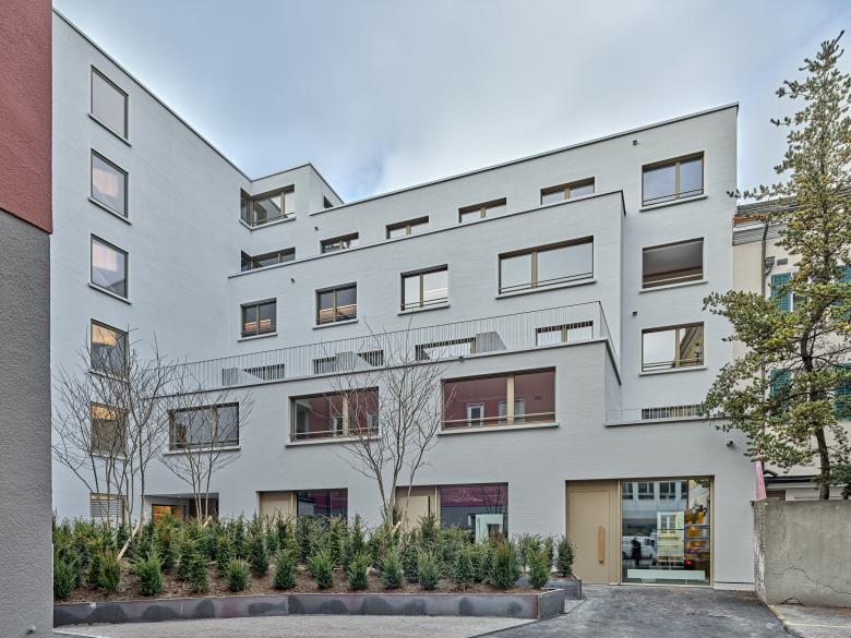 Das Gebäude wird durch innere und äussere Kräfte geformt und ist so auch ein Mediator zwischen äusserer und innerer Logik. In der Ausarbeitung von Volumen, Proportionen und äusseren Materialisierung wurden Elemente und Fluchten aus der Nachbarschaft aufgenommen und in einem eigenständigen Projekt mit zeitgemässen Grundrissen und eigenem Ausdruck zusammengeführt. Die baurechtlich notwendige Abtreppung wurde genutzt, um über die Ausbildung von Terrassen viel Tageslicht und private Aussenräume in einem dichten städtischen Kontext zu bieten. Das Erdgeschoss wird durch öffentliche und kommerzielle Nutzungen belebt und der Hinterhof durch einen neuen Kleinst-Grünraum aufgewertet. Im Innern gelang man nach dem Treppenhaus im ersten Geschoss über eine «rue intérieure» und im 3. Obergeschoss über einen lichtdurchfluteten Korridor zu den Wohnungen. Die Grundrisse inklusive Erschliessungsflächen sind auf jeder Etage verschieden, um jeder räumlichen Situation Rechnung zu tragen. Der vielfältige Wohnungsmix reicht von Kleinst- oder «Microappartements» über mittlere Maisonett- bis hin zu 4,5-Zimmer-Wohnungen. Wenige, dafür hochwertige und langlebige Materialien prägen die Innenräume des nach Minergie geplanten Gebäudes. Der ruhige Pol und tragende Kern bilden die Nasszellen, die konsequent übereinander liegen.