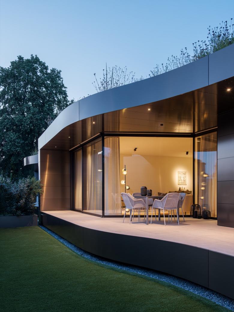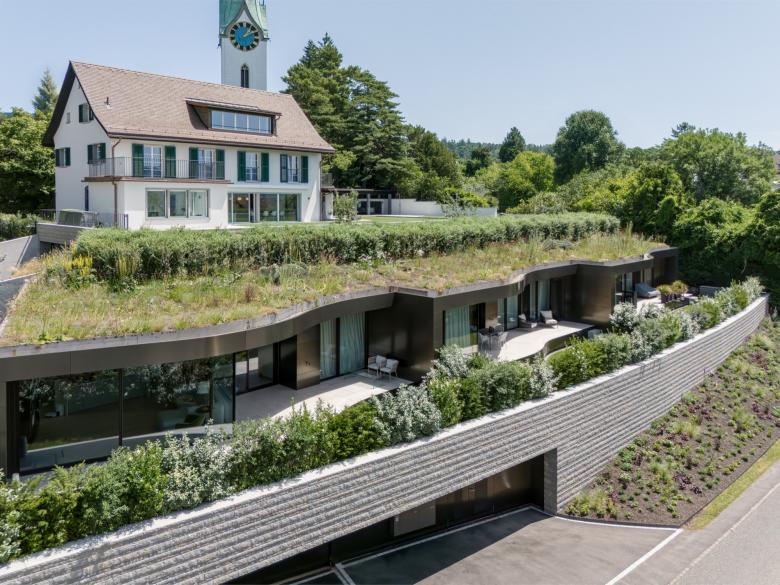 So entstand eine Wohnanlage, die sich heute als wahrer «hidden gem» präsentiert. Einerseits mit dem elegant umgebautem und massvoll renoviertem historischem Haupthaus mit modernstem Wohnkomfort und grosszügigem Garten mit Pool und Laube. Andererseits die im abfallenden Garten davor sanft und diskret eingebetteten drei neuen Wohnungen, die je als eigenständige «Townhouses» konzipiert sind. Sie sind unterirdisch via Tiefgarage mit dem Haupthaus verbunden. Eine geschwungene Natursteinmauer folgt dem Strassenverlauf, schützt die Anlage und prägt zugleich das neue Gesicht der Dorfmitte.