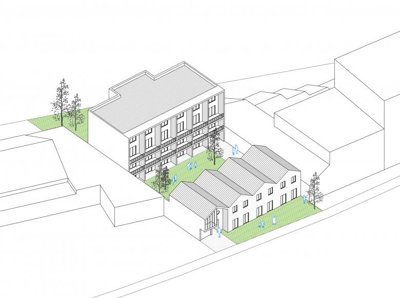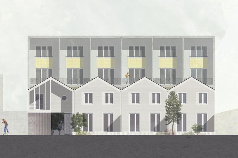 Die besondere Herausforderung bestand hier darin, die neuen Gebäude in die äußerst heterogene Umgebung des Mischgebietes aus Wohnen und Gewerbe einzupassen. Die Wohnanlage besteht deshalb aus zwei sehr unterschiedlichen Baukörpern, die jeweils durch ihre Typologie auf die umgebende Bebauung eingehen.